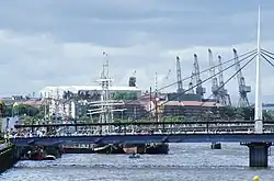The festival site covered 120 acres (0.49 km2), including 17 of water, on the south bank of the River Clyde at Plantation Quay in Govan, and also on land reclaimed from the partial filling-in of the Prince's Dock basin. Once the largest dock on the River Clyde when opened in 1900, it had been closed to navigation in the early 1970s with the advent of Containerization. Continuing businesses including Smith & McLean Galvanisers were now resited elsewhere in the city. Most of the docklands required had already been sold by the Clyde Port Authority to the private residential property developer Laing Homes. To ensure a clear site the Scottish Development Agency and Glasgow City Council identified suitable off-set sites within the city which Laing Homes then purchased and promptly developed, relinquishing their ownership of the dockland site.[1]