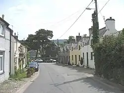It is credited as the start of the A4244 road, but in reality the road lies approximately 1 kilometre (0.62 mi) south of the village. "Infryn" means turf, therefore the name of the village means literally "blue/green turf".