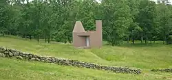 Several buildings on the property served specific functions: the Glass House served for entertaining, the study was used for work and the galleries for storing and displaying the art collection.[9] Johnson called other buildings his "follies" because their size, their shape or both made them unusable, such as the low-ceilinged Pavilion on the Pond or the Ghost House, a structure built with chain-link fencing on the foundation of an old barn and with lilies planted inside, inspired by his friend architect Frank Gehry.[23] Three other existing vernacular houses on the estate (Popestead, Grainger, and Calluna Farms) were remodeled by Johnson.[24][6]