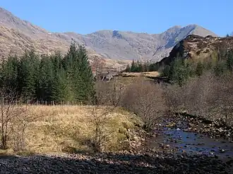 Gleann Dubh Lighe (also spelled Gleann Dubh-lighe) is a glen (valley) in Lochaber, Highland, Scotland, located at the foot of Streap in the Northwest Highlands mountain range. The Dubh Lighe river flows through the length of the valley.[1] A frequented spot for hiking, the valley is known for the eponymous bothy located in the valley which is maintained by the Mountain Bothies Association (MBA). It accidentally burned down in late 2011, but was rebuilt in June 2013 by volunteers of the MBA.[2][3][4]