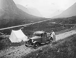 There are three official campsites in and around the glen.[6] Wild camping is permitted in certain areas of the Glen, in accordance with the Scottish outdoor access code and the principles specified by Percy Unna. However, environmental concerns and increasing pollution of the River Coe in the mid-1990s led to a decision to exclude a specific area and prohibit wild camping within that area. The area is to the east of the Clachaig Hotel, from the River Coe to the Aonach Eagach, and east as far as the junction of the Old Military Road and the modern A82. The exclusion has led to improvements being observed in the river and the Clachaig area.[48]