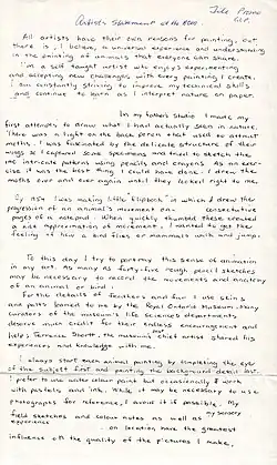 In the 1984 book A Brush With Life, Glen Loates explained his love for his nature saying, "I've taken more from nature than I can ever give in return. I owe so much, having painted all these beautiful things. If I can assist in preserving natural areas by lending my name to conservation projects or by using my art to draw attention to environmental issues, I feel I'm repaying an enormous debt of gratitude."[3]