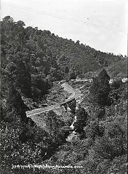 The Glen Massey Line was a private railway of 10.6 km near Ngāruawāhia in the Waikato region of New Zealand, built to serve coal mines, and, from 1935, run by the New Zealand Railways Department. The line had grades of 1 in 40, sharp curves – sharpest 6 ch (400 ft; 120 m) and 40 of less than 10 ch (660 ft; 200 m) – and 22 bridges, including a 91.5-metre-long and 18.3-metre-high timber trestle bridge over Firewood Creek halfway between Ngāruawāhia and Glen Massey and a 70-foot-long (21 m) bridge, adapted in 1917 to take sheep,[2] on 52 ft (16 m) piles over the Waipā River, as well as the railway, after collapse of the road bridge.[3][4]