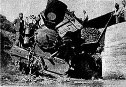 - 28 March 1933 – Wilton Collieries NO 1 and six wagons run away while shunting at Glen Massey on a 1 in 40 gradient; the train derailed at Windy Creek, killing driver William McLean.[28] The locomotive remains were cut in half and moved downstream of the railway bridge in 1936 to avoid damage to the railway bridge.[20]