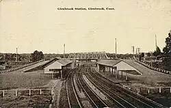 The initial ascent of modern-day Glenbrook began in 1866, when the construction of a railroad from Stamford's town center to nearby New Canaan fueled minor land speculation.[7]: 2  In October 1866, J.M.B. Whitton, a Philadelphia resident, purchased a 19-acre (7.7 ha) tract of land in the area, which was then known as New Hope, to divide into plots to resell to prospective residents.[7]: 2  This land included the old Dixon Homestead. The New Canaan railroad was built five years later, passing through the center of Whitton's land. Whitton laid out streets, including Cottage Avenue, Union Street, and Railroad Avenue.[9] In the years following Whitton's original 1866 purchase, a number of other businessmen purchase large tracts of land in the area to divide into individual residential plots.[7]: 2