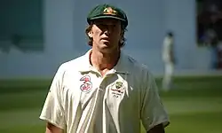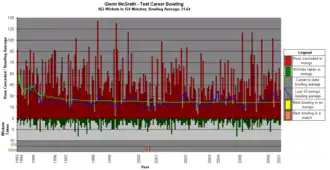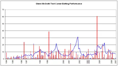 McGrath's batting prowess, in the early phases of his career, was poor; in fact, he scored first-ball ducks (zero runs) on both his Test[33] and One-Day International[34] debuts, and his batting average hovered below 4 for the first few years of his career. Years of patient tutelage from captain and friend Steve Waugh improved this aspect of his game to the point where he scored a Test half-century, which came on 20 November 2004[35] at the Gabba. His final score in that innings was 61, sharing a last wicket stand of 114 with Jason Gillespie (54*) to hilarity and the acclaim of their team-mates.[32] Nevertheless, McGrath was, for the duration of his career, regarded as a batting 'bunny', although he pushed his average above 7.00 runs/dismissal by the end of his career. In the first World Cricket Tsunami Appeal charity match, he was promoted to bat at number 6 ahead of specialist batsmen Stephen Fleming and Matthew Hayden, but was dismissed first ball trying to slog Muttiah Muralitharan. Towards the end of his international career McGrath, while not scoring many runs himself, became rather more difficult for opposing bowlers to dismiss, being dismissed only once during the 2005 Ashes series. With a contribution of 11 runs in the first innings of the MCG 2005 Boxing Day Test versus South Africa,[36] he stood his ground for 53 deliveries, helping Michael Hussey push the Australian tail to a record tenth-wicket stand against South Africa of 107 runs.