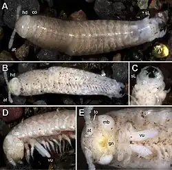 Some species, however, seem to deviate from the most common body plan. The description of an adult male of G. indus, for example, reports 37 pairs of legs, including a pair of telopods, and the same 21 segments are normally found in adult females.[8] Furthermore, the description of a species from another genus (Glomeridesmoides termitophilus) reports some deviations from the usual pattern, describing females with the usual 21 segments but only 35 leg pairs and two males with the same 21 segments (with 34 and 35 leg pairs, including a pair of telopods).[6] Millipedes in this family develop by hemianamorphosis, with leg and segment numbers decoupled such that individuals may reach the full complement of one before the other.[9][3]