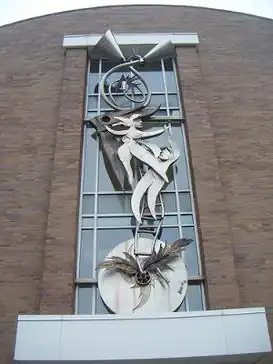 Glory is a sculpture created by American artist Garry R. Bibbs in 1999. The sculpture is installed above the entrance to the J. F. Miller Center, at the corner of West Michigan Street in Indianapolis, Indiana. Glory is made from fabricated steel and bronze. Angels and trumpets are the two distinct images visible within the sculpture. The sculpture is very large, with dimensions of 80 ft x 40 ft x 1 ft. Gibbs signed his name to the sculpture and included a copyright sign.
