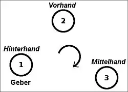 • Hörer (Hearer): Forehand. The hearer hears the bid of the speaker or 2nd speaker.