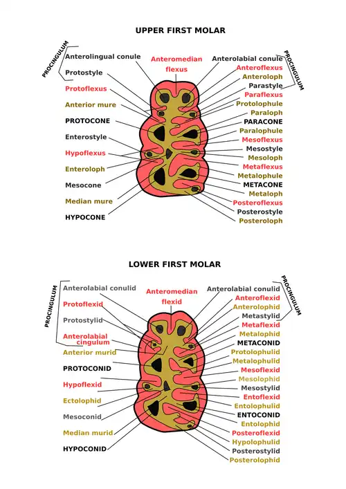 The structures within the molars receive different names according to their position and morphology. This nomenclature was developed by Henry Fairfield Osborn in 1907 and is, although with many variations, the one that continues today.[1][2][3]