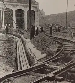 The UESCo appointed local magistrate and electrical engineer Charles Edward Knowles was appointed manager of the project,[2] and Leo Arthur Hards MIEE, an expert electric tramway engineer with the UESCo, was given responsibility for the layout of the system.[3] It was planned as a 4-mile (6.4 km) inverted 'C', with the north-west terminus in Hadfield, and the north-east at Old Glossop, joining relatively undeveloped stretches of roadway peppered with factories and large mills. A half-mile spur, known as the Whitfield Branch, ran south of the main track to Charlestown. The route was planned to be standard gauge, like other tramways in the Manchester region, powered by overhead catenary, and single-track with passing loops. For the depot and power station, a site on the north bank of the Glossop Brook at Dinting was selected. Tracklaying began in December 1902. Seven open top, double decker tramcars with reversed stairs were ordered.[2]