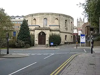 The building was designed by Sir Robert Smirke in the neoclassical style, built in ashlar stone and opened in August 1816.[5][6][7] The design involved a symmetrical main frontage in the form of a polygon of nine equal sides facing onto Bearland. The central bay featured a portico, which was projected forward, contained a round headed doorway with a fanlight and was surmounted by a parapet; it was flanked by single-storey porters' offices on either side. The main two-storey structure behind was fenestrated by plain sash windows on the ground floor and by alternating round headed windows and round headed blind recesses on the first floor, and was surmounted by a parapet.[2] Internally, the principal rooms were two full-height semi-circular courtrooms separated by a main corridor which was accessed through the portico.[8] The separate courtrooms enabled nisi prius i.e. civil cases and criminal cases to be tried simultaneously, and the gallery could accommodate 400 people.[9]