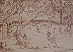 Glover's Cave is part of an extensive natural karst system that extends from Christian to Todd counties in Kentucky. Over 3.2 km of the cave have been surveyed.[1] The cave was used for many purposes since its discovery by Native American Indians. They inhabited a major entrance to the cave from about 10,000 years ago until 1,000 years ago. Col. Raymond C. Vietzen,[2] an amateur archaeologist from Ohio, performed large excavations with permission from the Glover family from 1941 through 1980s.[3][4] He published The Saga of Glover's Cave in 1957 for which it is best known. The archaeological site has the Smithsonian trinomial designation of 15CH315. Some of the artifacts may be on display at the New Indian Ridge Museum.[5] Previously known as "Bell's Cave", it was used during the American Civil War as a camp.[6] Also, legend has it that Jesse James used the cave as a hide-out on his way to rob the Russellville, Kentucky bank. The property is privately owned and protected.