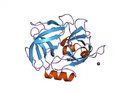- ^ Filipek R, Rzychon M, Oleksy A, Gruca M, Dubin A, Potempa J, Bochtler M (October 2003). "The Staphostatin-staphopain complex: a forward binding inhibitor in complex with its target cysteine protease". The Journal of Biological Chemistry. 278 (42): 40959–40966. doi:10.1074/jbc.M302926200. PMID 12874290.