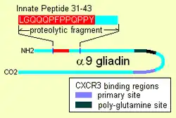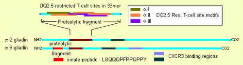 {{cite journal}}: CS1 maint: multiple names: authors list (link) - ^ 1 "α-I" site, 3 "α-II" sites, and 2 "α-III" sites, Qiao SW, Bergseng E, Molberg Ø; et al. (August 2004). "Antigen presentation to celiac lesion-derived T cells of a 33-mer gliadin peptide naturally formed by gastrointestinal digestion". J. Immunol. 173 (3): 1757–62. doi:10.4049/jimmunol.173.3.1757. PMID 15265905.