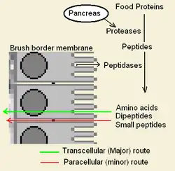 Some alpha gliadin have other direct-acting properties. Other gliadin peptides, one in a glutamine rich region and another peptide, "QVLQQSTYQLLQELCCQHLW", bind a chemoattractant receptor, CXCR3. Gliadin binds to, blocks and displaces a factor, I-TAC, that binds this receptor.[2] In the process it recruits more CXCR3 receptor, increases MyD88 and zonulin expression.[1][9] The factor it displaces, I-TAC, is a T-cell attractant. This peptide may also be involved in increased risk for type 1 diabetes as zonulin production is also a factor.[10] This triggering of zonulin ultimately results in the degradation of tight junctions allowing large solutes, such as proteolytic resistant gliadin fragments to enter behind the brush border membrane cells.