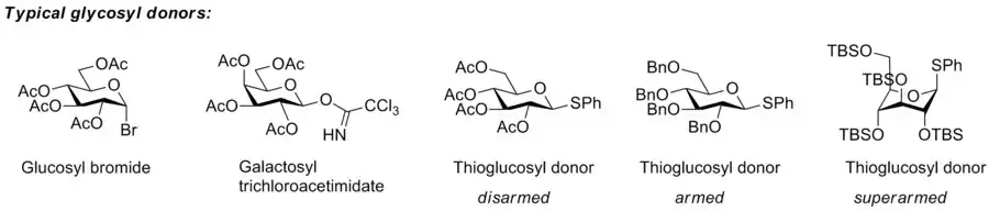 The concept has been extended to superarmed glycosyl donor by Mikael Bols and his collaborators. He realised that the hydroxy groups of carbohydrates are less electron-withdrawing towards the anomeric center when they are axial than when they are equatorial, which means that glycosyl donor conformers with more axial oxy functions are more reactive.[5] Protection of a glycosyl donor with bulky silyl groups (tert-butyldimethylsilyl or triisopropyl) cause it to change conformation to a more axial-rich conformation that, as a consequence, is more reactive, which Bols and his group called superarmed. They showed that a superarmed donor can be coupled to an armed glycosyl donor/acceptor.[6]