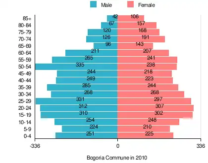 According to the 2011 Poland census, there were 7,983 people residing in Bogoria Commune, of whom 50% were male and 50% were female. In the commune, the population was spread out, with 21.9% under the age of 18, 38.3% from 18 to 44, 21.9% from 45 to 64, and 17.8% who were 65 years of age or older.[1]