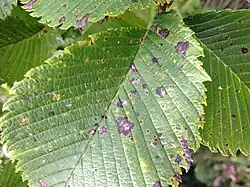 Sanitation, or removal all leaf debris seems to be the best method of control.[1] In commercial growing arenas, it is suggested that overhead watering should not be used, because it helps spread the pathogen.[1] Resistance greatly varies between species.[1] U. thomasfi seems to be the most resistant.[4] The majority of elms seem to be tolerant.[4] A dominant gene conferring resistance to U. parvifolia was discovered, though it did not provide absolute resistance.[5] There is currently no information about fungicides used to control this disease.[1] This disease is not typically fatal and is not actively addressed.[3] Aeration seems to moderately reduce growth and sporulation.[6] Cool temperatures and high humidity enhance the disease, so avoidance of these conditions will decrease the prevalence of disease.