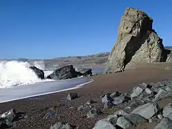 The sea stacks along the coast at Goat Rock Beach consist of rocks from the Franciscan Complex, formed within an era of plate collision along the western coast of North America. From about 200 to 30 million years ago, the North American Plate was in continual collision with the Farallon Plate.[3] A variety of rock types resulted from this collision, including pillow basalt, chert, and marine sandstone. During the plate collisions, these rocks were considerably faulted and crushed into melange, which is a mixture of ground-up matrix and resistant pockets of rock floating within. When melange is eroded by wave action, the softer part of the matrix is washed away, leaving the more resistant blocks exposed in the ocean as sea stacks. Goat Rock is such a flat topped[4] sea stack consisting of a block of resistant greywacke.