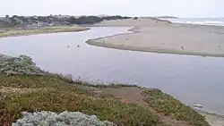 During the summer months, a sandbar is built up along the beach and separates the Russian River from the Pacific Ocean. This sandbar is breached whenever the water levels reach heights between 4.5–7 feet (1.4–2.1 m) at the Jenner visitor center.[1] Breaching of the sandbar during late fall/early winter splits the beach in two sections. The northern section is protected by the Russian River flowing into the ocean and creates an ideal location for harbor seal pupping.
