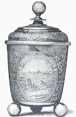 The diameter at the top is 12 centimetres, and the cup stands on three soldered balls that raise the cup by about two centimetres. The outside of the cup is decorated with engravings. These are beautifully drawn and elaborate arabesque ornaments. Three oval medallions show different subjects and are captioned to the story below. Further text and two coats of arms are found on the underside of the cup; they are those of André Falquet and the city of Augsburg. A lid completes the piece. It consists of an undecorated closing rim and a quarter-round decorated rim; separated by an almost flat intermediate piece, a cone with a little crown and a sphere at the top rises from it. The cup is made of gilded silver. Except for the feet and the medallions, the gilding is complete. The total height of the cup is 22 centimetres and it weighs 552 grams.[1]