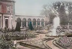 The family home was a double-cube fronted building of brick with stone dressings and a baluster parapet. To the east of this was a five-bedroom dining block that looked out onto the gardens.[4] When last occupied by the family, The Lawn had an outer and inner hall on the ground floor (giving access to a lobby and drawing room), a dining room with adjoining study, billiard room, library and gun room. There were two staircases leading to the various bedrooms, some with adjoining dressing rooms, and also the nursery and servants' quarters.