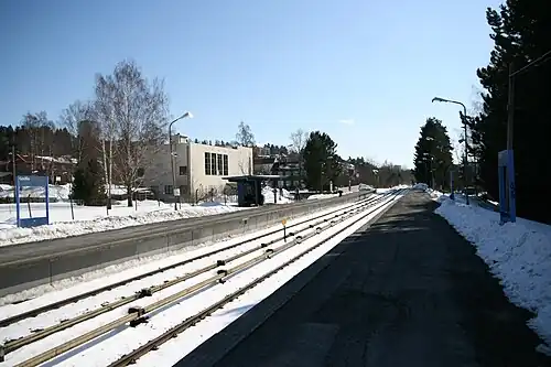 Godlia (ⓘ) is a station on the Østensjø Line (Line 3) on the Oslo Metro. It is the first station after the line diverges from the Furuset Line and is located between the stations of Hellerud and Skøyenåsen, 6.1 kilometers (3.8 mi) from Stortinget. The station was opened as a subway station 29 October 1967. Karl Stenersen was the station's architect.[1] Rail service through Godlia is older, having opened as a tram line already in 1926.[2]