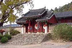 The hyanggyo consists of two parts: first, the Myeongnyundang (lecture hall), which contains the Oesam outer gate and the east and west dormitories. The second is the ritual area that includes the Naesam inner gate, Daeseongjeon (Confucian shrine hall), and the east and west Mu. This style of structure forms a Jeonhakhumyo, which means that lecture hall is placed in the front and the ritual hall in the rear. Jeonhakhumyo-type hyanggyos are situated on gently-sloping sites to emphasize the sacredness of the Confucian shrine.[1] Sujik House, next to the Hyanggyo, houses Confucian students.