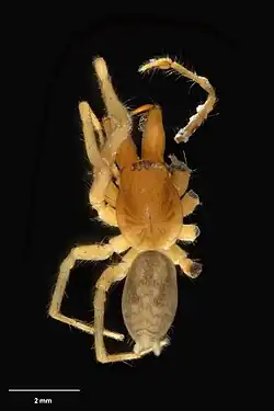 The male is recorded at 5.59mm in length whereas the female is 5.57mm. The cephalothorax is coloured pale brown with dark shading. The legs are pale brown with dark bands. The abdomen is shaded black and has a chevron pattern dorsally.[1]