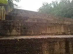 Originally an unlined chute, the dam spillway was damaged during floods in early 1890. It was replaced by an un-reinforced concrete stepped spillway – the first of its type in the world and the precursor of modern roller-compacted concrete (RCC) stepped spillways. The dam and its spillway system were refurbished several times, including in 1974 and 2004. Most of the 1890 concrete stepped spillway cascade is still in use.