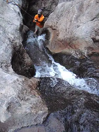 The hike to the hot springs is difficult and requires technical equipment such as ropes and ascending and descending gear.[5] There have been a number of fatalities (mostly from heat exposure) in the Canyon, including two hikers who died on one day in June 2003.[6] Although the trail was previously open year-round, in 2016 the National Park Service closed the trail in summer months (generally May 15 – Sept. 30) due to dangers from extreme heat.[7] To reach the hot springs from the trail, one encounters a series of eight difficult rope descents. After the descent, hikers reach a series of hot spring soaking pools, hot waterfalls and grottos.[1]