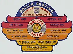 Once national organizations were established to oversee competitions rules, state organizations soon followed. One of the most innovative organizational structures was America on Wheels (AOW). First established in 1941 and operating well into the 1970s, AOW rinks were members of the United Rink Owners association. AOW was a chain of east coast rinks, primarily in New York and New Jersey, that readied competitors through training and regular meets among a group of rinks. At AOW's peak, they numbered 22.[3] The organization managed the rinks while a group of investors sought venues to invest, and in the 1940s, rinks were built in geographic regions that held promise for economic growth. Over time, as both insurance liability costs and real estate values rose, rinks were sold off for better investment opportunities.[3]