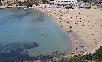 Golden Bay (Maltese: Il-Mixquqa) is one of the bays and sand beaches in Malta. It was previously known as Military Bay.[1] The white beach slopes gently allowing swimmers to easily walk into the sea. In summer months, there are lifeguards on duty. Golden Bay is the most popular tourist beach of the Manikata region. Several beach clubs and a large hotel are located on the beach. The Ghajn Tuffieha International Scout Campsite is also located nearby offering an all-year-round camping experience for everyone.[2] A bus terminus and car park are located at Golden Bay.[1] [3]