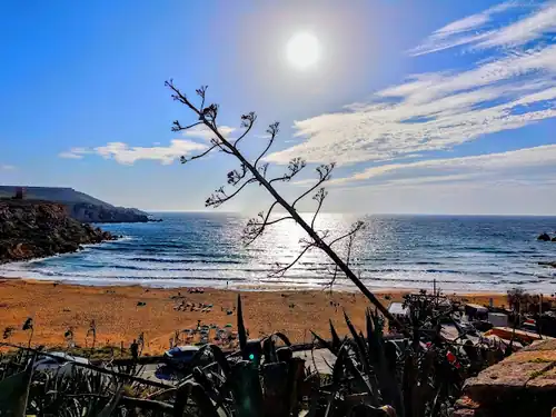 A weathered agave or century plant cactus stands sentinel on the golden sands of Golden Bay, Malta, offering a unique contrast between the arid and the aquatic.