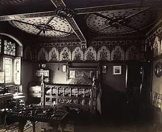 The Golden Bed is a bed designed by the English architect and designer William Burges in 1879 for the guest bedroom of the home that he designed for himself in Holland Park, The Tower House. It is now in the collection of the Victoria & Albert Museum (V&A) in South Kensington.[1] The bed was made by John Walden and carved by Thomas Nicholls. The painting in the central panel of the headboard was executed by Henry Holiday, and the motifs and figures on the bed painted by Fred Weekes.[1] The bed is made from polished hardwood, mahogany and pine.[1]
