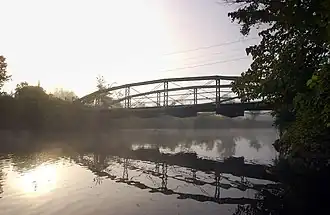 The Golden Hill Bridge is a historic bridge on Golden Hill Road over the Housatonic River in Lee, Massachusetts. It is a lenticular pony truss bridge built c. 1885 by the Berlin Iron Bridge Company, and is the state's oldest surviving bridge of this type. It is one of only five Berlin Co. bridges in the Berkshires, and is the only known surviving bridge to implement modifications to the pony truss design patented by William O. Douglas in 1885.[2] The bridge was listed on the National Register of Historic Places in 1994.[1]