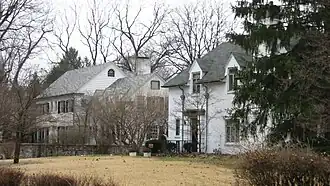 Although it had been platted in 1872, the neighborhood that became known as Golden Hill remained undeveloped until David McLean Parry, a wealthy industrialist and president of the Parry Manufacturing Company in Indianapolis, acquired property in the area between 1900 and 1907 to build a new home. Parry named his private estate Golden Hill.[2][3][4] Scottish landscape architect George MacDougall designed the grounds for the estate on 100 acres (40 hectares) of woods and rolling terrain overlooking the White River.[2][5]