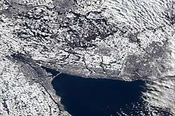 The western end of Lake Ontario during the winter. The region takes its name from the horseshoe shape.