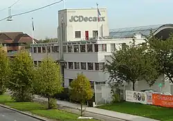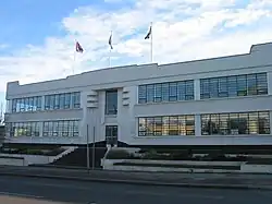 - The Firestone Tyre Company. Built 1928, designed by Wallis, Gilbert and Partners.[3][4] It was the first overseas factory built by the Firestone company of America. The building frontage was demolished during a public holiday in August 1980 shortly before a preservation order was due to be served on it to retain the Art Deco architecture.[5][6] The Art Deco gatehouse was demolished in 2004 to make way for increased parking facilities. The remaining gates, railings, and piers are in a Jazz Modern style and are Grade II listed.[4]