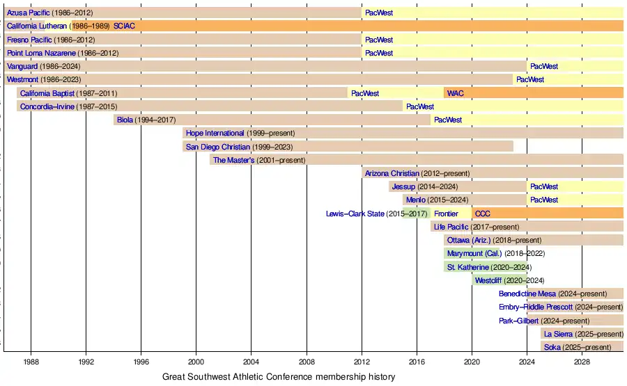 In recent years, the conference has seen changes with members leaving the GSAC and the NAIA for the NCAA. In 2011 Cal Baptist left the GSAC to join the Pacific West Conference followed by the announcement that Azusa Pacific, Fresno Pacific and Point Loma Nazarene joined Cal Baptist in the PacWest in 2012.[1] Concordia then left to join the PacWest in 2015, and Biola applied to make the same move in 2017. To replace these schools, the GSAC has added Arizona Christian, Menlo and William Jessup (now known as Jessup). Life Pacific joined in 2017 and Ottawa (AZ) joined in 2018 to bring the GSAC to 10 members.
