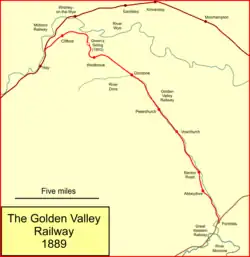 The Golden Valley Railway was a railway company which constructed a branch line from Pontrilas in Herefordshire, England, to Hay on Wye. Pontrilas was on the Great Western Railway main line between Newport and Hereford. The Golden Valley Railway Company opened the first part of its line from Pontrilas to Dorstone in 1881. It was constantly beset with shortage of money, but opened an extension to Hay in 1889. Its directors had grand ideas of extending further to Monmouth and forming part of a long-distance trunk route. It issued misleading promotional material which secured significant investment from the public, but exposure of the falsehoods resulted in collapse.