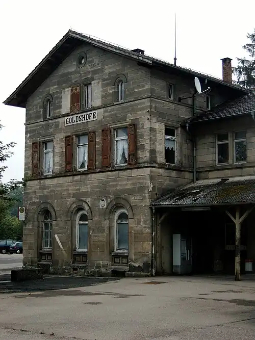 Goldshöfe station is a station in the German state of Baden-Württemberg at the junction of the Goldshöfe–Crailsheim railway and the Stuttgart-Bad Cannstatt–Nördlingen railway. In addition to its function as a junction station it also serves the towns of Hüttlingen and Buch in the municipality of Rainau, both about two kilometres away.[3] The station was named after the nearby farmhouse of Goldshöfe, which today is part of the Aalen district of Hofen.