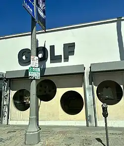 The first Odd Future store was opened on Fairfax Avenue in 2011.[7] The Odd Future would come to be the first retail space that sold Golf Wang.[7] In 2014, Tyler described in a series of tweets that the Odd Future store on Fairfax Avenue had closed.[33] On October 25, 2017, Tyler announced that he would open the Golf Wang flagship, named "GOLF" on 350 North Fairfax Avenue in Los Angeles, California.[34][35][2] The new location officially opened on October 26, 2017, and features an indoor skating bowl.[36][35] A second "GOLF" storefront opened on November 12, 2022, located on 35 Howard Street in New York, NYC. Finally, third "GOLF" storefront opened in London on October 21, 2023, becoming the first store to open outside of the United States launching their "GOLF ACROSS THE POND" limited time campaign. Tyler held meet and greets at both stores upon their opening.