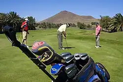 A player usually carries several clubs during the game (but no more than fourteen, the limit defined by the rules). There are three major types of clubs, known as woods, irons, and putters. Woods are played for long shots from the tee or fairway, and occasionally rough, while irons are for precision shots from fairways as well as from the rough. A new type of club called a hybrid combines the straight-hitting characteristics of irons with the easy-to-hit characteristics of higher-lofted woods. A hybrid is often used for long shots from difficult rough. Hybrids are also used by players who have a difficult time getting the ball airborne with long irons. Wedges are irons used to play shorter shots. Wedges are played from difficult ground such as sand or the rough and for approach shots to the green. Putters are mostly played on the green, but can also be useful when playing some approach shots. Putters have minimal loft, meaning the ball stays close to the ground when struck. The most common clubs to make up a set used to be a driver, 3 and 5-woods, irons numbered from 3 to 9, pitching wedge, sand wedge, and putter. Modern sets commonly include hybrids, often replacing the longer irons and 5-wood, and/or additional wedges such as a gap or lob wedge. Players may choose to play with any combination of clubs, limited by the rules to a maximum of 14.[2]