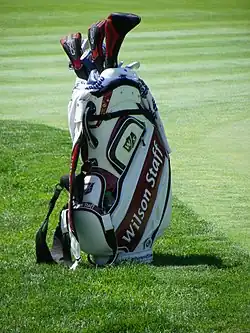 - Staff bags are the largest class of golf bags, and are generally seen carried by caddies or other assistants to professional or high-level amateur players. Staff bags are generally the same size or larger than a cart bag, and typically feature a single shoulder strap, a large amount of storage for equipment and even spare attire, and large logo branding designed for product placement on televised events.
