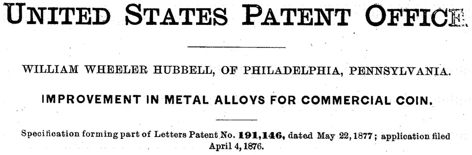 Goloid is an alloy of silver, gold and copper patented by Dr. William Wheeler Hubbell on May 22, 1877 (U.S. patent #191,146). The patent specifies 1 part gold (about 3.6%), 24 parts silver (about 87.3%), and 2.5 parts copper (about 9.1%, all by weight); however, the patent also states that "The proportions may be slightly varied" and goes on to specify that the silver portion can range from 20 times to 30 times that of the gold, and the copper could range from one-eighth to one-twelfth (from 12.5% to 8.33%) of the total mixture. The patent specifies that the metals be separately melted, then mixed, along with "sulphate of sodium or sulphate of potassium" in the amount of one part sulfate to one thousand parts metal. The alloy, in varying proportions (sometimes slightly out of these specifications), was used by the United States Mint to strike pattern dollars, sometimes called "metric dollars" (some were marked with "metric" in the coin design, while all had metal proportions and total coin weight as design features) from 1878 to 1880. Patterns of the same design were struck in other metals, including aluminum, copper, normal coin silver, lead, and white metal.