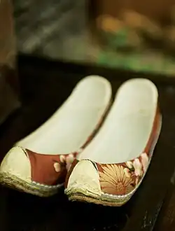Gomusin (Korean pronunciation: [komuɕʰin]) are shoes made of rubber, built in the form of traditional Korean shoes.[5] The shoes are wide with low heels. Gomusin for men were modeled after "gatsin" (갖신), and ones for women were danghye (당혜). Gomusin first appeared in the early 20th century; they were easier to keep clean than danghye and jipsin (straw shoes) and they could be worn when during wet weather, attracting popularity and replacing traditional footwear.[6]