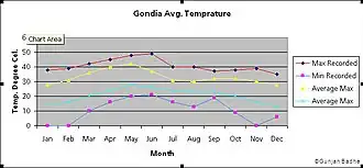 Gondia experiences extreme variations in temperature with very hot summers and very cold winters and has an average relative humidity of 62 per cent. Average recorded rainfall is more than 1,200 mm (47 in) in each rainy season (June to September).