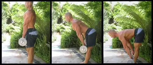 The lifter bends forward, bowing at the hips while keeping the back straight. This is the eccentric portion. The motion is at its halfway point when the lifter's torso is almost parallel with the ground, after which the lifter returns to the upright position, during the concentric portion.